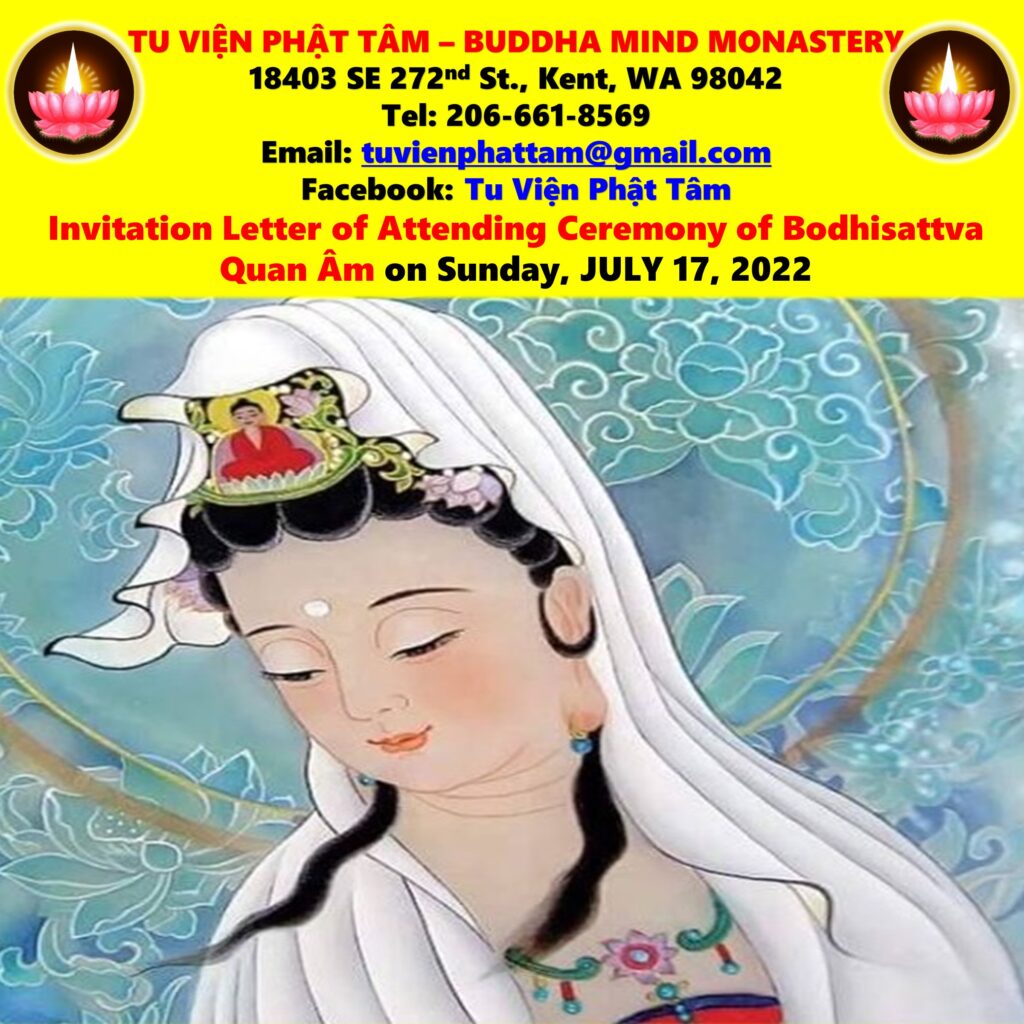 This year, in order that our life has more peace and joy, Buddha Mind Monastery happily holds the Ceremony of Bodhisattva Quan Âm on Sunday, July 17, 2022 for Buddhists devotees near and far. The program will take place as follows: