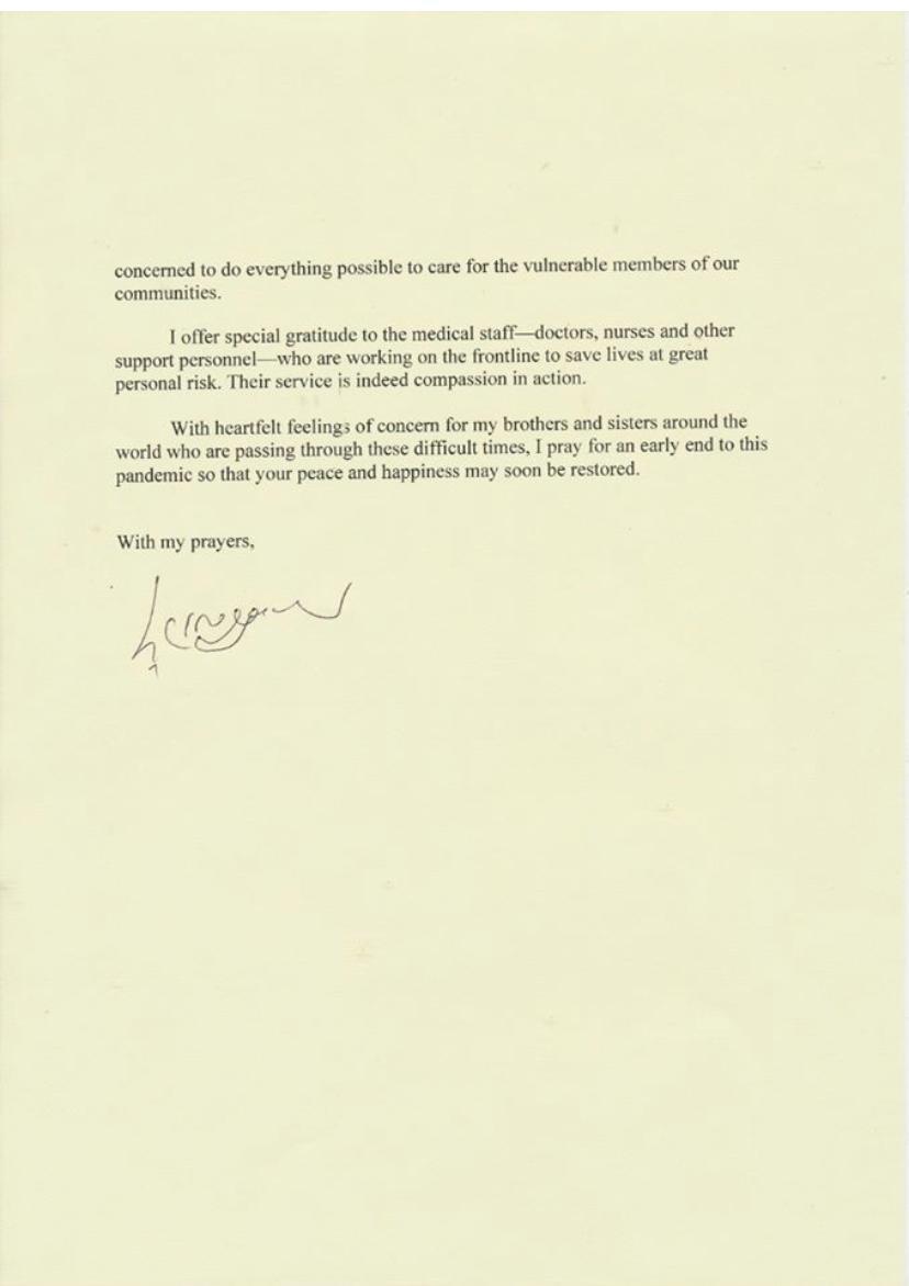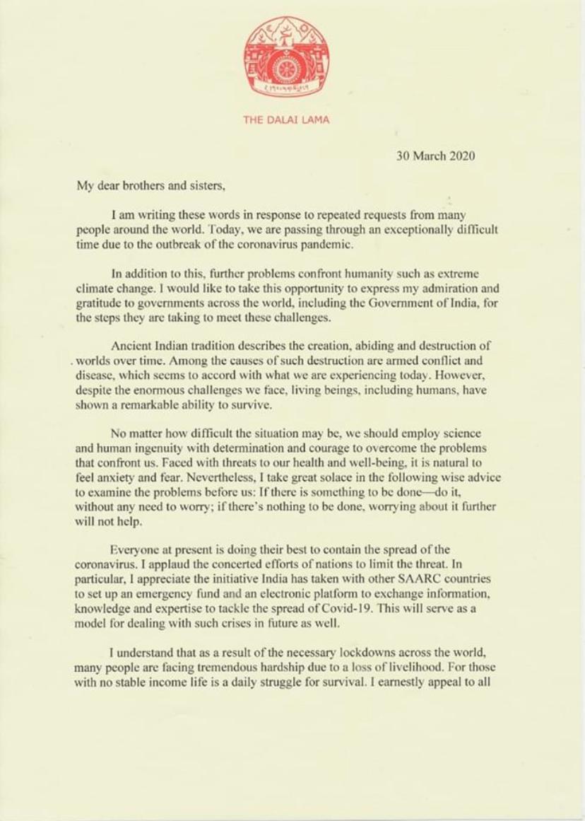 My dear brothers and sisters, I am writing these words in response to repeated requests from many people around the world. Today, we are passing through an exceptionally difficult time due to the outbreak of the coronavirus pandemic.In addition to this, further problems confront humanity such as extreme climate change. I would like to take this opportunity to express my admiration and gratitude to governments across the world, including the Government of India, for the steps they are taking to meet these challenges.Ancient Indian tradition describes the creation, abiding and destruction of worlds over time. Among the causes of such destruction are armed conflict and disease, which seems to accord with what we are experiencing today. However, despite the enormous challenges we face, living beings, including humans, have shown a remarkable ability to survive.No matter how difficult the situation may be, we should employ science and human ingenuity with determination and courage to overcome the problems that confront us. Faced with threats to our health and well-being, it is natural to feel anxiety and fear. Nevertheless, I take great solace in the following wise advice to examine the problems before us: If there is something to be done—do it, without any need to worry; if there’s nothing to be done, worrying about it further will not help.Everyone at present is doing their best to contain the spread of the coronavirus. I applaud the concerted efforts of nations to limit the threat. In particular, I appreciate the initiative India has taken with other SAARC countries to set up an emergency fund and an electronic platform to exchange information, knowledge and expertise to tackle the spread of Covid-19. This will serve as a model for dealing with such crises in future as well.I understand that as a result of the necessary lockdowns across the world, many people are facing tremendous hardship due to a loss of livelihood. For those with no stable income life is a daily struggle for survival. I earnestly appeal to all concerned to do everything possible to care for the vulnerable members of our communities.I offer special gratitude to the medical staff—doctors, nurses and other support personnel—who are working on the frontline to save lives at great personal risk. Their service is indeed compassion in action.With heartfelt feelings of concern for my brothers and sisters around the world who are passing through these difficult times, I pray for an early end to this pandemic so that your peace and happiness may soon be restored.