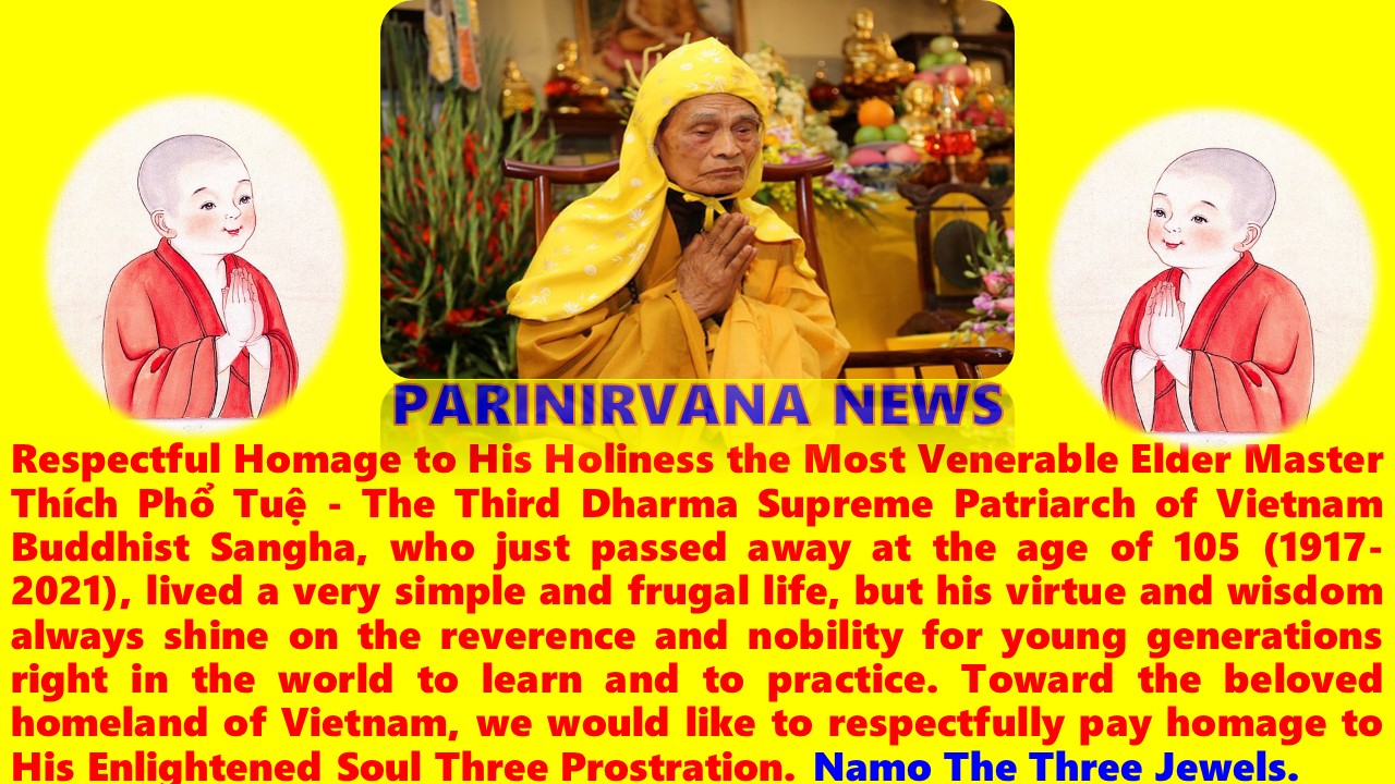 In accordance with the law of impermanence, His Holiness, the Most Venerable Elder Master Thích Phổ Tuệ, the Third Dharma Supreme Patriarch of Vietnam Buddhist Sangha, just passed away at Vien Minh Root Temple, Quang Lang Commune, Phu Xuyen District, Hanoi City, Vietnam.
