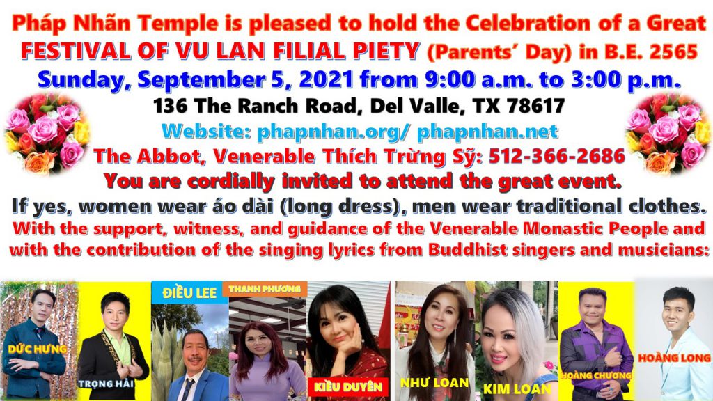 On the occasion of this yearly VU LAN Festival, Phap Nhan Temple will organize the precepts Board to transmit the novice precepts for Dharma Brother Pháp Thanh with the support and presence of Monastics, Buddhists, and non-Buddhists near and far. The Ceremonial Day program will happen as follows:
