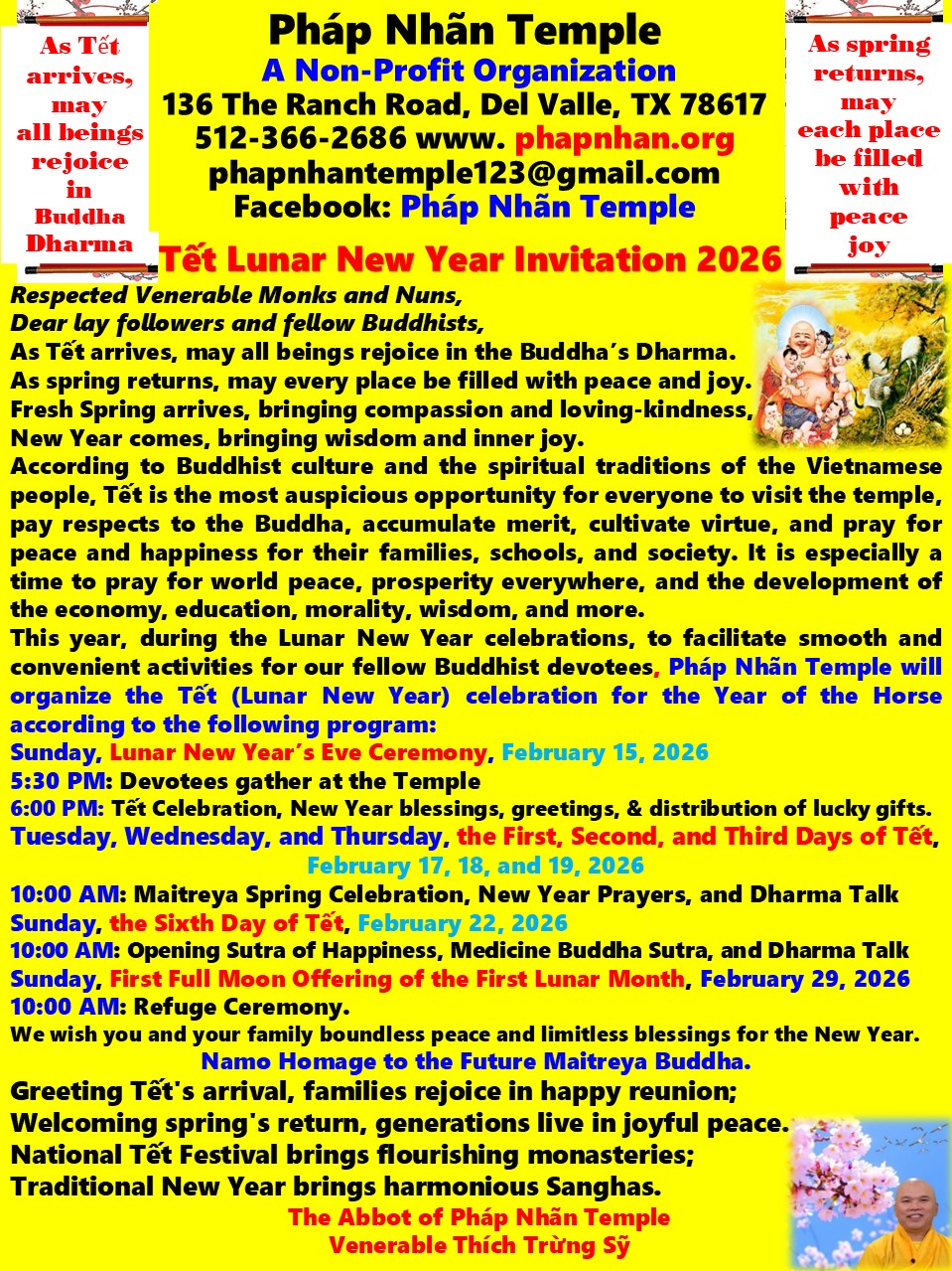We respectfully invite our fellow Buddhist devotees to visit Pháp Nhãn Temple and participate in Tết, the Lunar New Year of the Horse 2026 program. For those who are far away, please kindly send your Prayer Requests for Peace to the Temple so that the monks may read your names during the sutra chanting sessions and offer prayers on your behalf.
