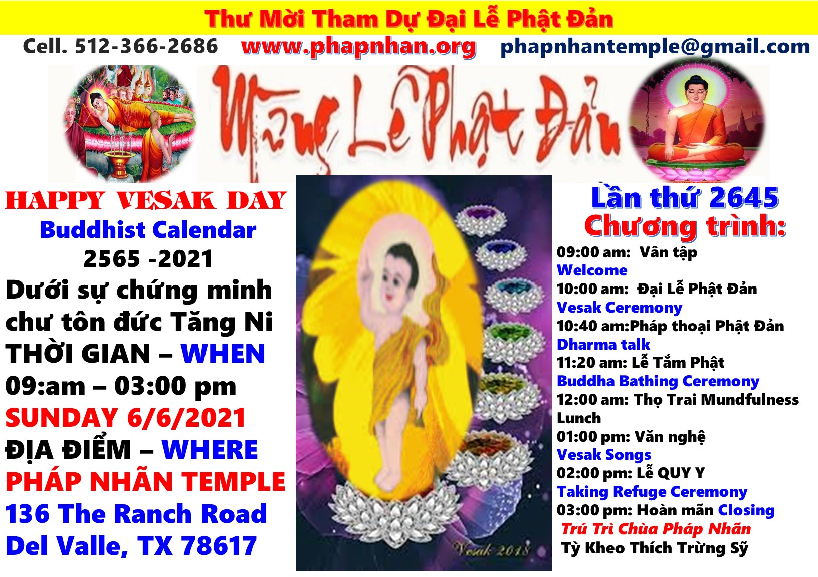 To celebrate the Great Ceremony of the Buddha’s Birthday this year, Pháp Nhãn Temple has enough wholesome conditions to invite the Most Venerable Thích Pháp Quang, Bhante Gnanaratana, Bhante Thilakarathana, Senior Venerable Monks Thích Tâm Đạo, Thích Nhuận Tánh, Thích Huệ Cảnh, and fellow Buddhists coming to the Temple to attend this great event. We are very happy to welcome you all.