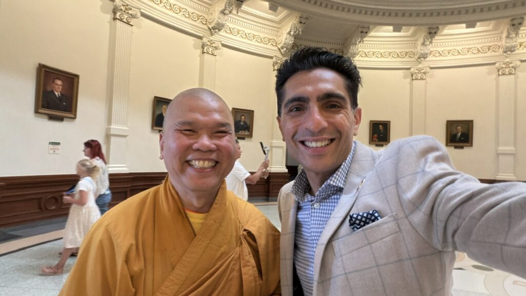 A joyful selfie captured with Rep. Salman Bhojani (Texas House of Representatives) and Venerable Thầy Trừng Sỹ at the Texas Capitol in Austin on November 5, 2025