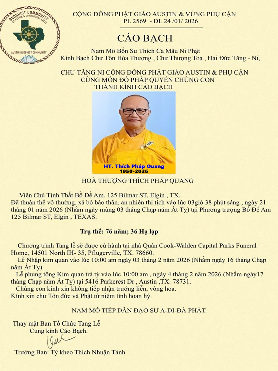 Cộng Đồng Phật Giáo Austin và đại diện môn đồ Pháp quyến, Chùa Pháp Nhãn chúng con kính báo tin cho Đại Chúng liễu tri và xin Đại Chúng góp Phần cầu nguyện.