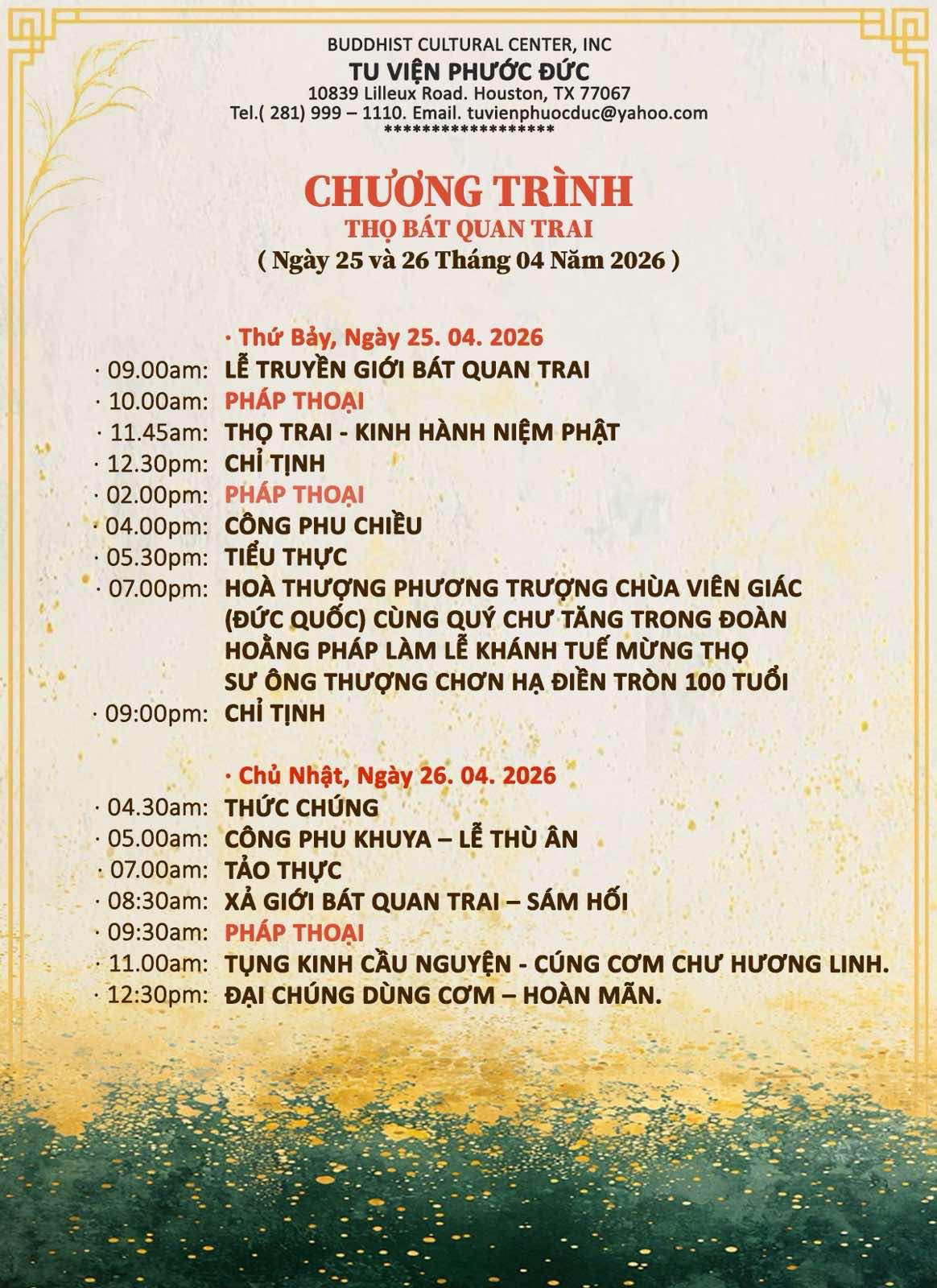 – Ngày 25 & 26.4.2026 Khóa Tu Bát Quan Trai và giảng pháp tại Tu Viện Phước Đức, nơi TT. Thích Trí Hiền Trụ Trì. Tel. 281-999-1110.