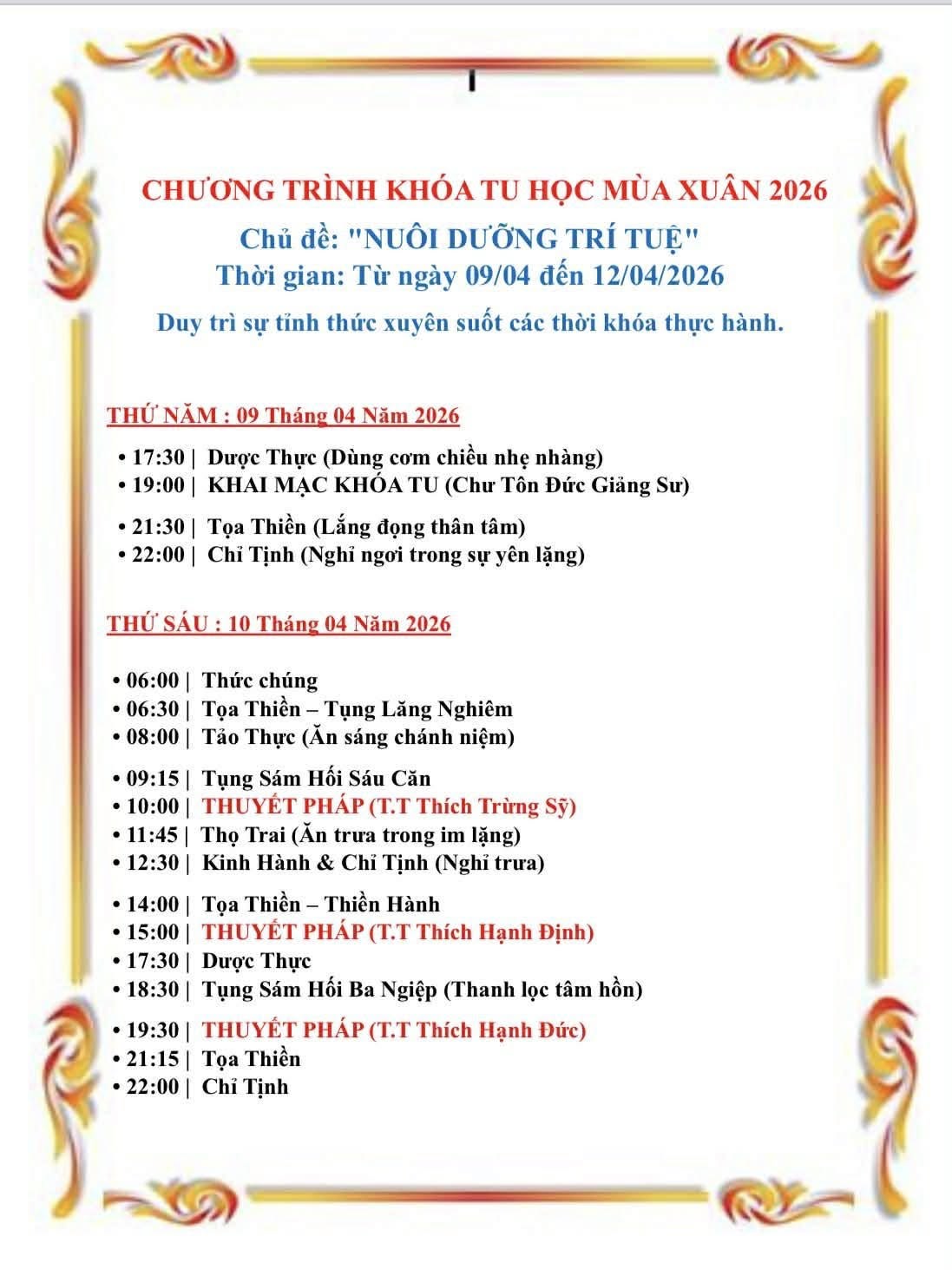 – Có khóa tu học và giảng Pháp cho quý Phật Tử tại Thiền Viện Chánh Pháp, nơi Thượng Tọa Trúc Thái Bảo Trụ Trì từ ngày 9 đến ngày 12.4.2026 (Từ thứ Năm cho đến chủ Nhật)