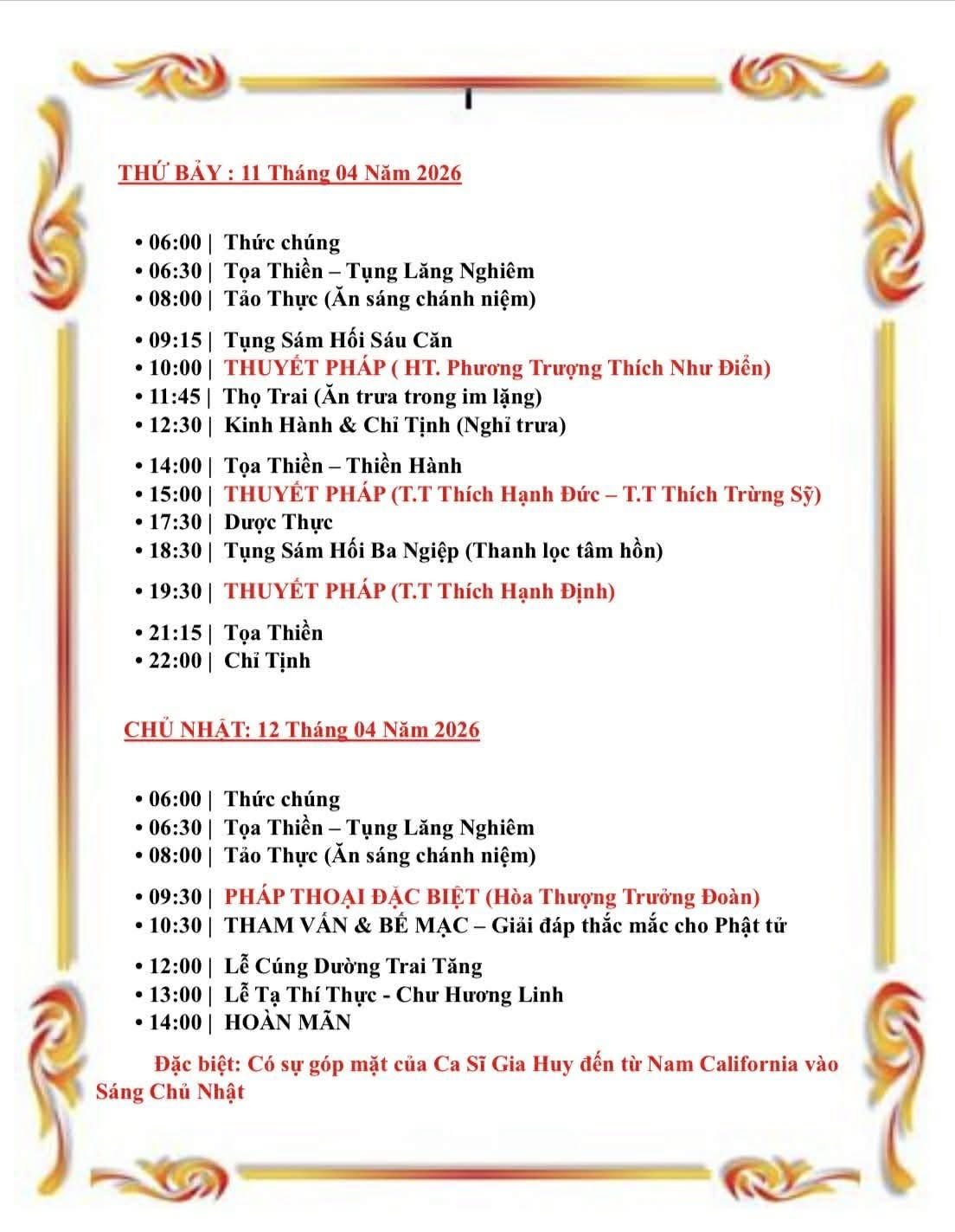 – Ngày 4&5.4.2026 (thứ Bảy & chủ Nhật) tu tập và giảng Pháp tại chùa Niết Bàn.