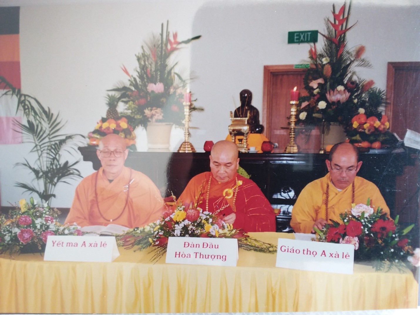 Bên trái là Trưởng Lão Hòa thượng Thích Minh Tâm, Giữa là Trưởng Lão Hòa thượng Thích Như Huệ, và bên phải là Trưởng Lão Hòa thượng Thích Chơn Thành.
