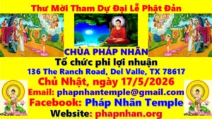 Để đón mừng Đại Lễ Phật Đản năm nay, Chùa Pháp Nhãn có đủ duyên lành cung thỉnh chư Tôn đức Hòa thượng Trưởng Lão, chư Thượng tọa, Đại Đức Tăng Ni, và quý Phật tử Đồng Hương về Chùa tham dự sự kiện trọng đại này. Rất hoan hỷ và tiếp đón Đại Chúng quang lâm.