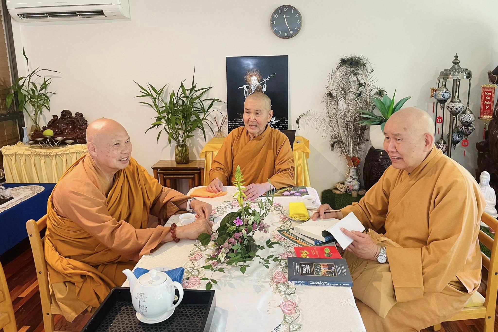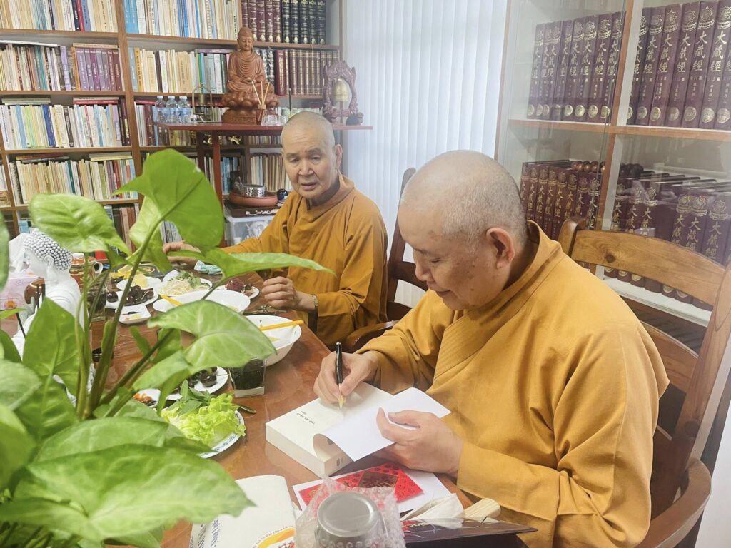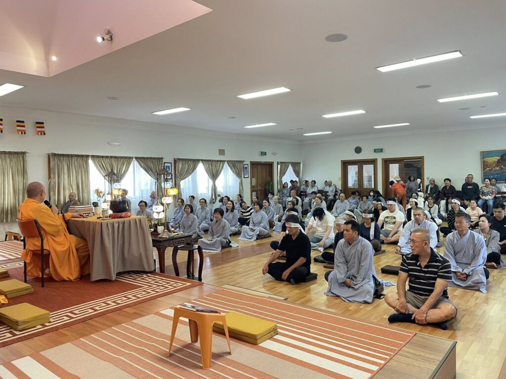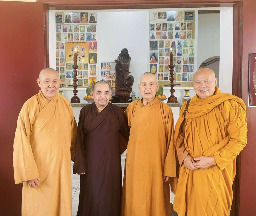 Sáng Chủ Nhật ngày 11.1.2026 chúng tôi được Phật tử Chúc Vũ chở từ Thiền Lâm Pháp Bảo về Tổ Đình Pháp Bảo để gặp gỡ Anh Quảng Giải Huỳnh Kim Hóa, đương kim Trưởng Ban Hướng Dẫn GĐPTVN Hải Ngoại, đến vấn an sức khoẻ của tôi cũng như trình bày về trại Vạn Hạnh trong thời gian sắp đến. Kế tiếp là gặp gỡ Quý Phật tử tại Thiền Đường chùa Pháp Bảo từ 10:00AM đến 11:15AM cùng ngày. Đề tài hôm đó tôi đã nói về tinh thần Phật Giáo của Nguyễn Du qua truyện Kiều và phần cuối đã giới thiệu về các Tạng Kinh Phật Giáo bằng Hán Văn, Linh Sơn Pháp Bảo Đại Tạng Kinh và Thanh Văn Tạng bằng Việt ngữ v.v…, mọi người chăm chú lắng nghe và rất hoan hỷ với thời Pháp Thoại nầy, trong khi đó trời bên ngoài đã bắt đầu có những giọt mưa nặng hạt, để bù lại cho thời tiết ngày trước đó đã lên trên 40 độ C. Kế tiếp Đạo Hữu Giáo Sư Chân Đạo Hành đã giới thiệu tác phẩm “Dễ nhất là tu tại gia” với thính chúng và nhiều người thỉnh sách để ủng hộ chương trình kiến tạo mái ngói tháp Vãng Sanh tại Pháp Bảo.